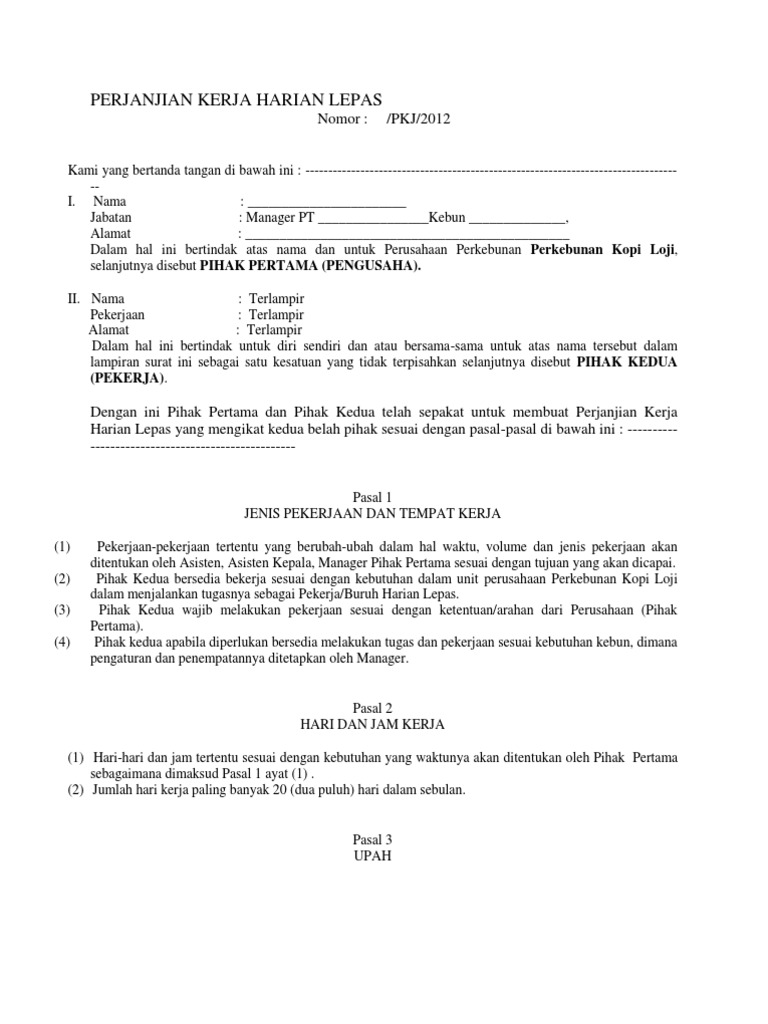 Surat perjanjian kerja karyawan tetap. Surat perjanjian kerjasama ini dibuat dalam rangkap 2 dua diatas materai yang cukup letter this agreement is part time full time kontrak artikel ini berisi contoh surat perjanjian kerja yang diperuntukan bagi karyawan harian karyawan paruh waktu dan karyawan. Kebanyakan perusahaan ketika sedang membutuhkan staff baru ataupun penerimaa staff, maka biasanya dalam proses penerimanaannya akan memerlukan sebuah perjanjian yang harus ditandatangani diantara kedua belah pihak. Siapa saja pastinya selalu melakukan kerjasama untuk semakin memperluas link ataupun sebagai bentuk kerjasama dalam hal pekerjaan. Savesave contoh surat perjanjian kontrak kerja karyawan sed. Kami yang bertanda tangan di bawah ini Diharapkan dengan adanya surat kontrak kerja karyawan, menandakan keduanya menjalin sebuah kesepakatan kerjasama untuk mencapai sebuah tujuan berkenaan dengan hak dan kewajiaban antara kedua belah pihak. Contoh surat perjanjian kerja harian lepas. Contoh surat perjanjian kerja harian lepas surat perjanjian kerja harian lepas nomer: Download contoh surat perjanjian kerja, surat yang mengikat hubungan kedua belah pihak selama periode waktu kerja tertentu. Pihak pertama adalah pemilih rumah yang akan dikontrakan, sedangkan pihak kedua adalah orang yang hendak menyewa rumah tersebut. Gunakanlah informasi ini untuk mengetahui apa saja kerja yang harus anda lakukan pada perusahaan tersebut. Saat masuk bekerja di sebuah perusahaan pertama kali sebelumnya pasti anda menandatangani kontrak kerja.